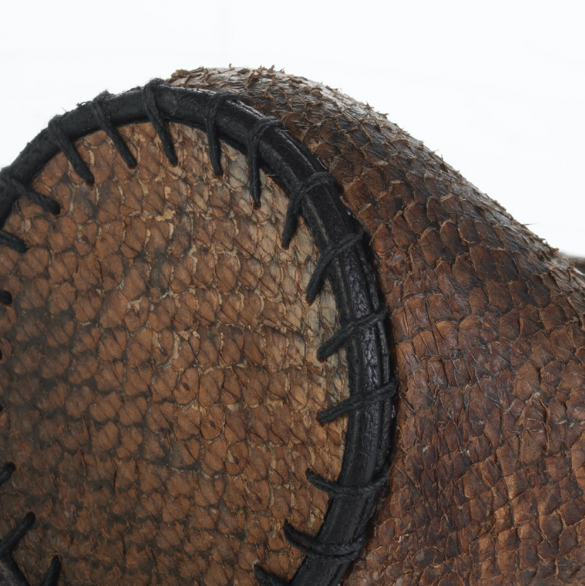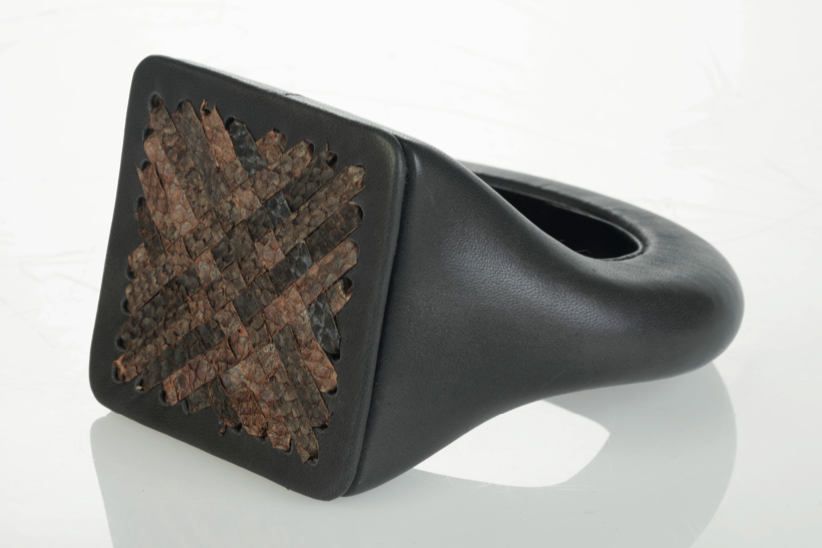 Sea Bass leather (food waste tanned), oak bark tanned calf, sheep napa, wood