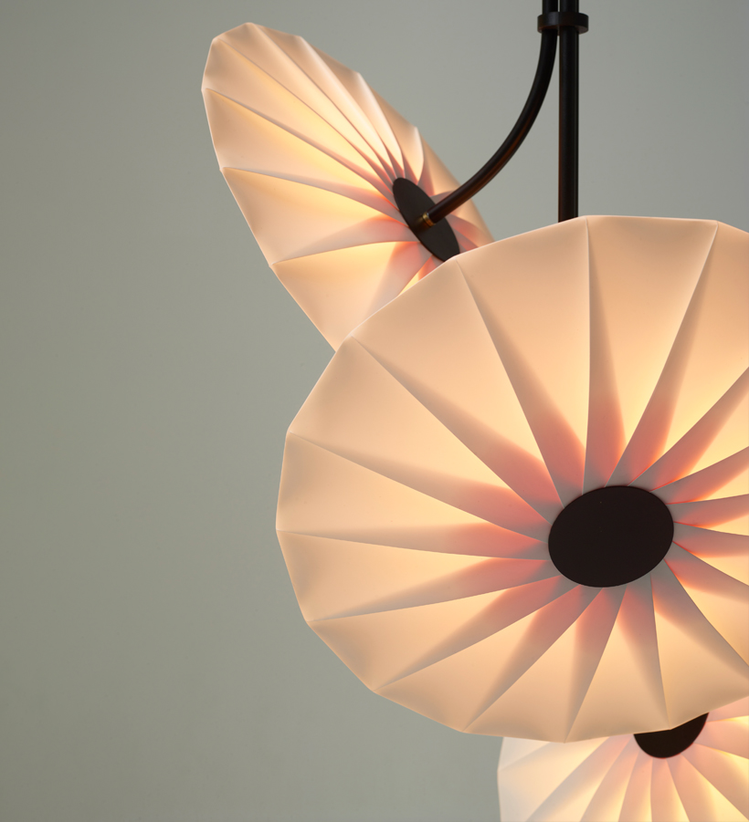Bloom is an evolving collection of origami lights that draw inspiration from the delicate beauty of spring blossoms. Crafted from paper, each piece is not only lightweight but also entirely recyclable. Meticulously pleated, the warm embrace of illumination breathes life into these crafted shades, revealing a captivatingly layered gradient of colours. The play of light and shadow dances upon each pleat, evoking a sense of wonder and tranquility reminiscent of a blossoming garden in full bloom.