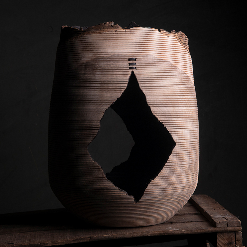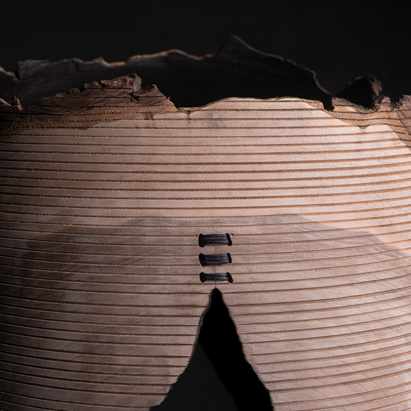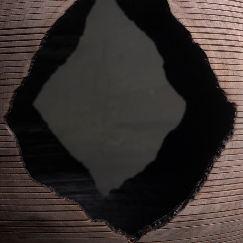 Conny was turned from green walnut wood with a deteriorated pith. Rather than concealing this flaw, the pith was removed and a lateral opening was introduced, allowing a view into the vessel from an unexpected angle, like looking through a window into a roofless structure. The form expands toward the base, emphasizing weight and grounding. Finished with wood stain to preserve its raw texture, the piece was made from a walnut tree felled due to illness.