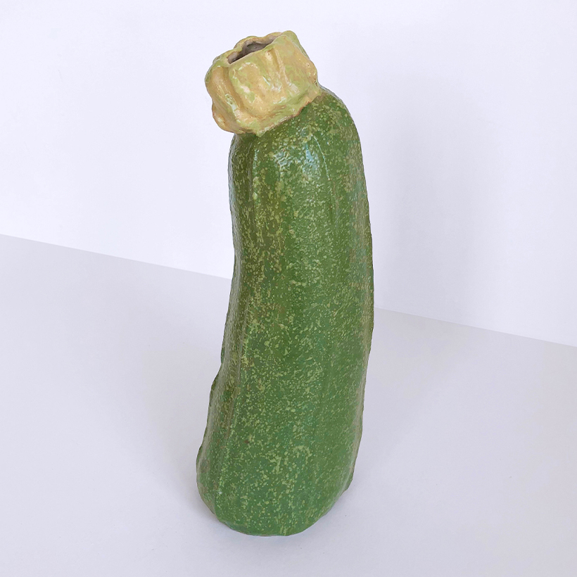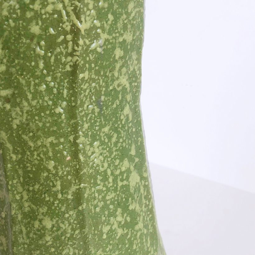 Courgette Vase is a sculptural piece finished with a chromium-based glaze, a material that is difficult to control at high temperatures. Combining chromium with nepheline syenite preserves its colour range, while the speckled yellow-green surface is created using a dripping technique, giving each piece a subtle, organic character.