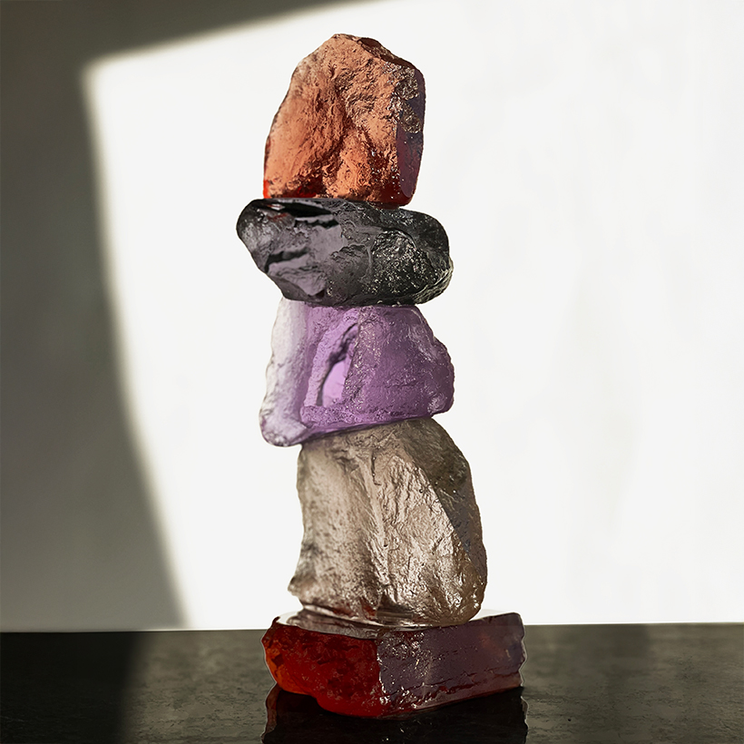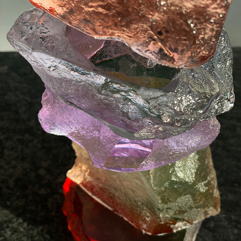 This Time Rock Stack is made up of a collection of small rocks cast in dichroic glass. Placed by natural light and in combination with artificial lighting the colours in the glass will shift. The colours here are a very good representation of the glass we use in our Time Rocks including a golden colour that picks of tones of green in natural light and a beautiful sienna rock topping the stack. The shift of the colour throughout the day is gentle and enlightening.
