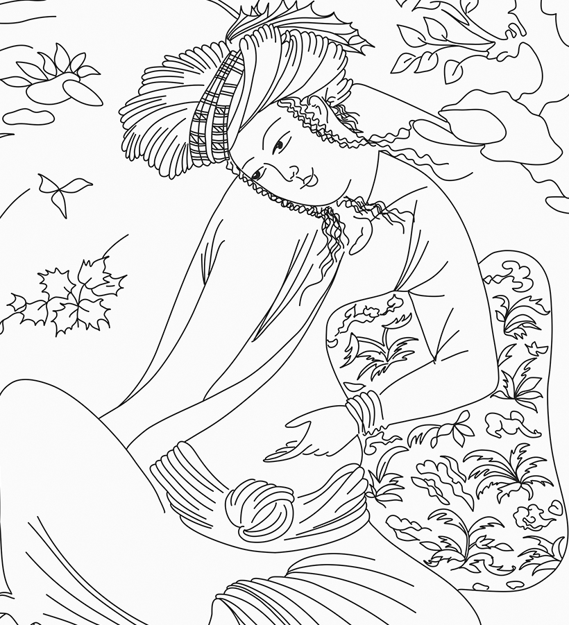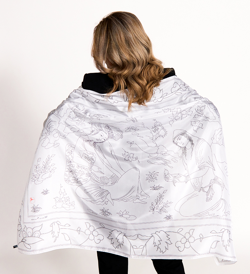 The design on this scarf is Nazanin's interpretation of an early 17th Century drawing by an unknown Persian artist. They have given it the name “Lovers” as it would appear to represent a man and a woman in a romantic environment. But it could also represent the theme of poetry and poets, who were as important a part of Persia’s artistic and cultural traditions as was miniature painting. The original drawing is now in the possession of the Metropolitan Museum of Art, New York City.