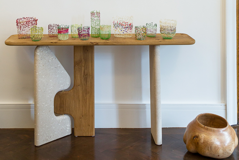 The console table was design with locality in mind. For this piece, the wood is sourced from Hever in Kent, 40 miles south from London and seasoned by Bruce Saunders, fellow member at Blackhorse Workshop. The wood is then hand-carved and finished with natural oils by the designer. In collaboration with Catherine Martin from James Stonework in Malvern, the complementary stone legs are shaped from Jordan’s Whitbed extracted in Portland, about 180 miles from East London. All parts are assembled together by brass details including a tubular hinge allowing the stone leg to rotate and find the perfect third point of stability.