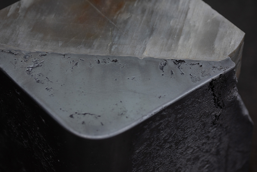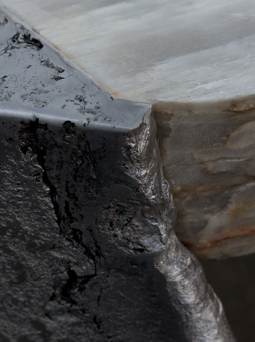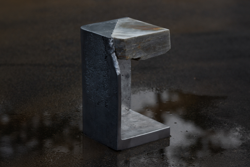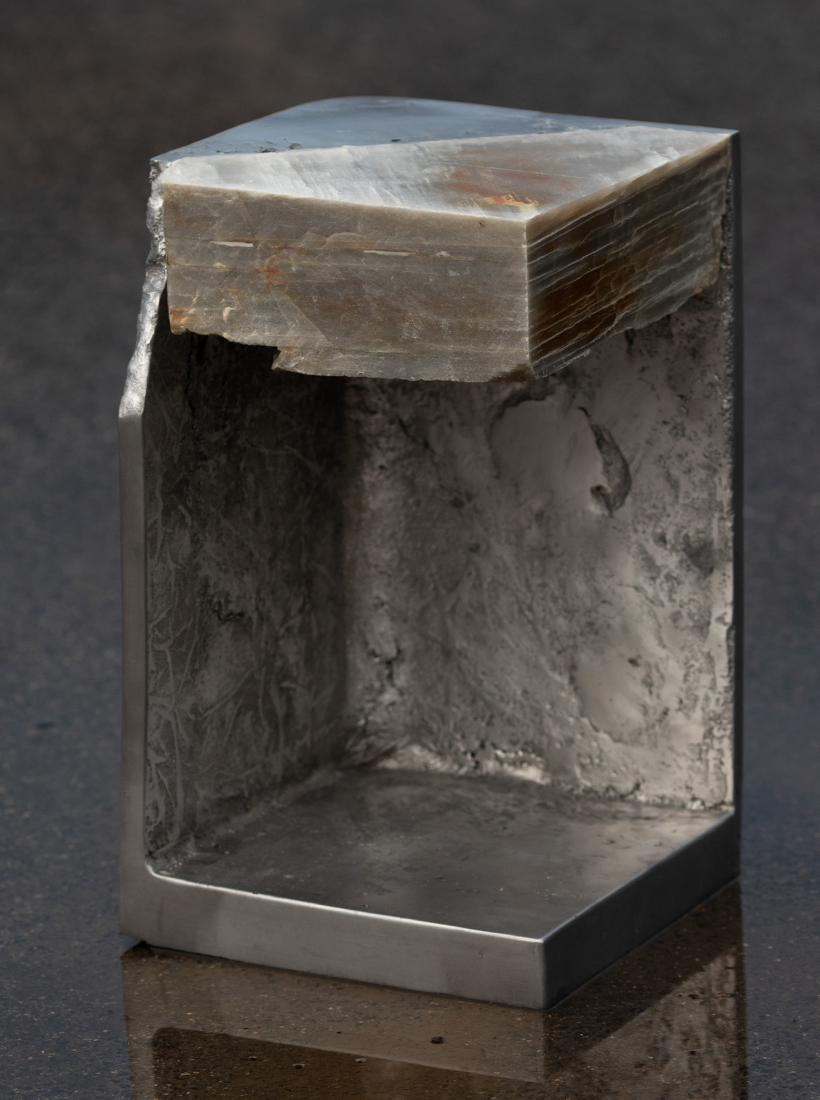 Formsophy is the artistic practice of Alicja Prussakowska and Jakub Kijowski. Their profound fascination lies in textures, materials, and the stories these elements convey. NAR is a small sculptural object exploring the contrast between raw and refined materials. A solid piece of beige onyx with warm copper undertones is set into a cast aluminum form. The stone’s natural translucency and fractured edges meet the textured surface of metal, creating a quiet dialogue of opposites — warmth and cold, softness and rigidity. Though compact, the piece holds a strong presence, balancing material tension with a sense of stillness.