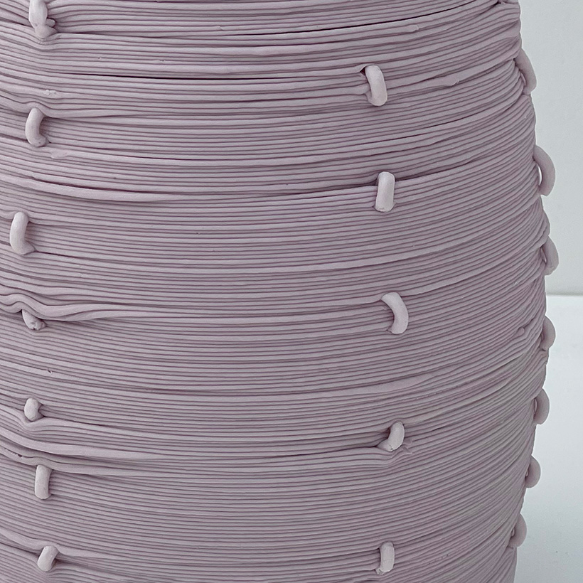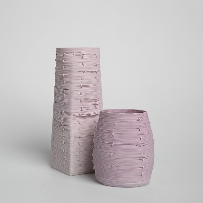 NNN is interested in reconnecting design with human touch. The designer implements a human element into the printing script by weaving coiled clay into the vessels while they are printing. Intervening in the ceramic 3d-printing process, creates opportunities for intentional disruption, structure change and beautiful accidents. Thus, no two prints are ever identical. NNN is a celebration of organic manmade error and the presence of humanity into the man-made machine; the resulting works offer richly textured surfaces and unfamiliar volumes.