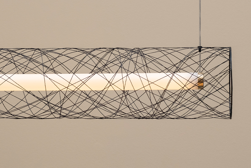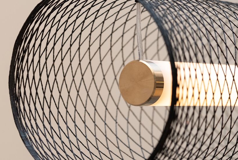Atelier Robotiq is a Rotterdam-based design studio founded by Søren Blomaard and Anne-Lise Heydra, where aerospace engineering, product design, fine arts, and robotics converge. The studio creates contemporary light sculptures and innovative designs characterised by light, geometric abstraction, and iconic, pure forms. Their Out of Order fixture explores the transition from robotic precision to expressive disorder, as if guided by the robot’s own 'free will'. The ultra-lightweight cylindrical form, made from wound industrial yarn and reinforced with resin, appears as a three-dimensional play of suspended lines.