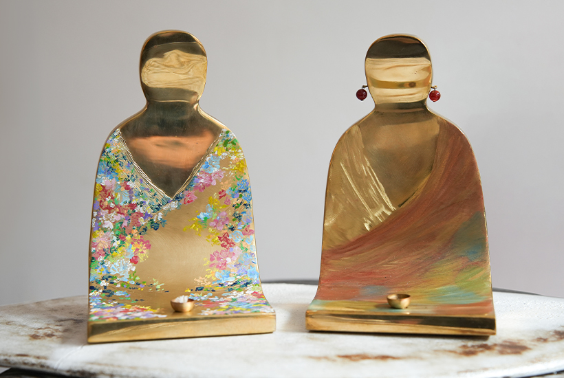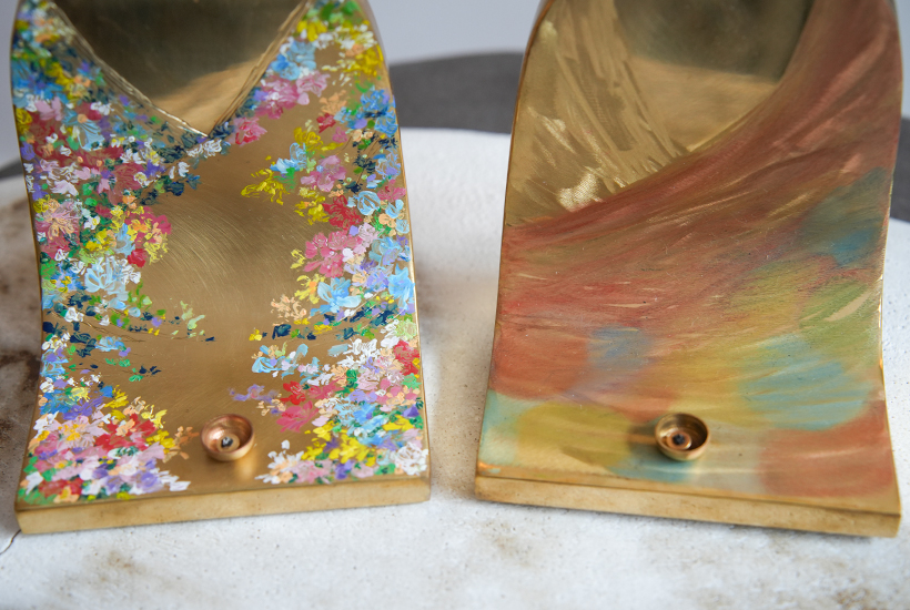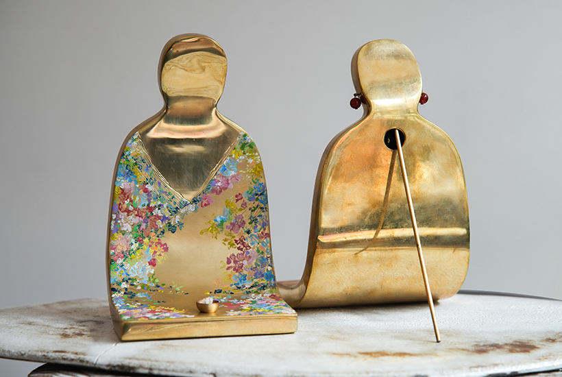 Self-Portrait Series draws its inspiration from Zen meditation experiences in the mountains. Hsaio simplified and abstracted the serene posture of meditation, transforming it into lines and forms filled with Zen sensibility. The surface of the work features a unique texture inspired by monastic robes. When the light is lit, the flame cast a unique silhouette on the bronze surface. Hsiao’s intention is when the viewer stand in front of it, the patterns and fire serving as a gentle reminder: let go of distractions and embrace the tranquility of the present moment.